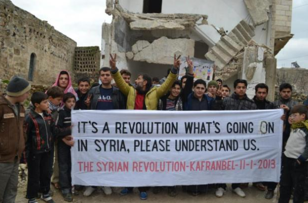 Kafranbel activists hold up a banner in support of the Syrian revolution (Facebook)