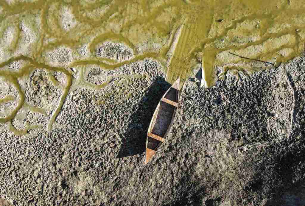 رجل يجلس في قارب حيث كانت بحيرة الدويسات قبل أن تجف عند سد الدويسات في إدلب (كافة الصور بواسطة عز الدين الادلبي ميدل أيست أي)