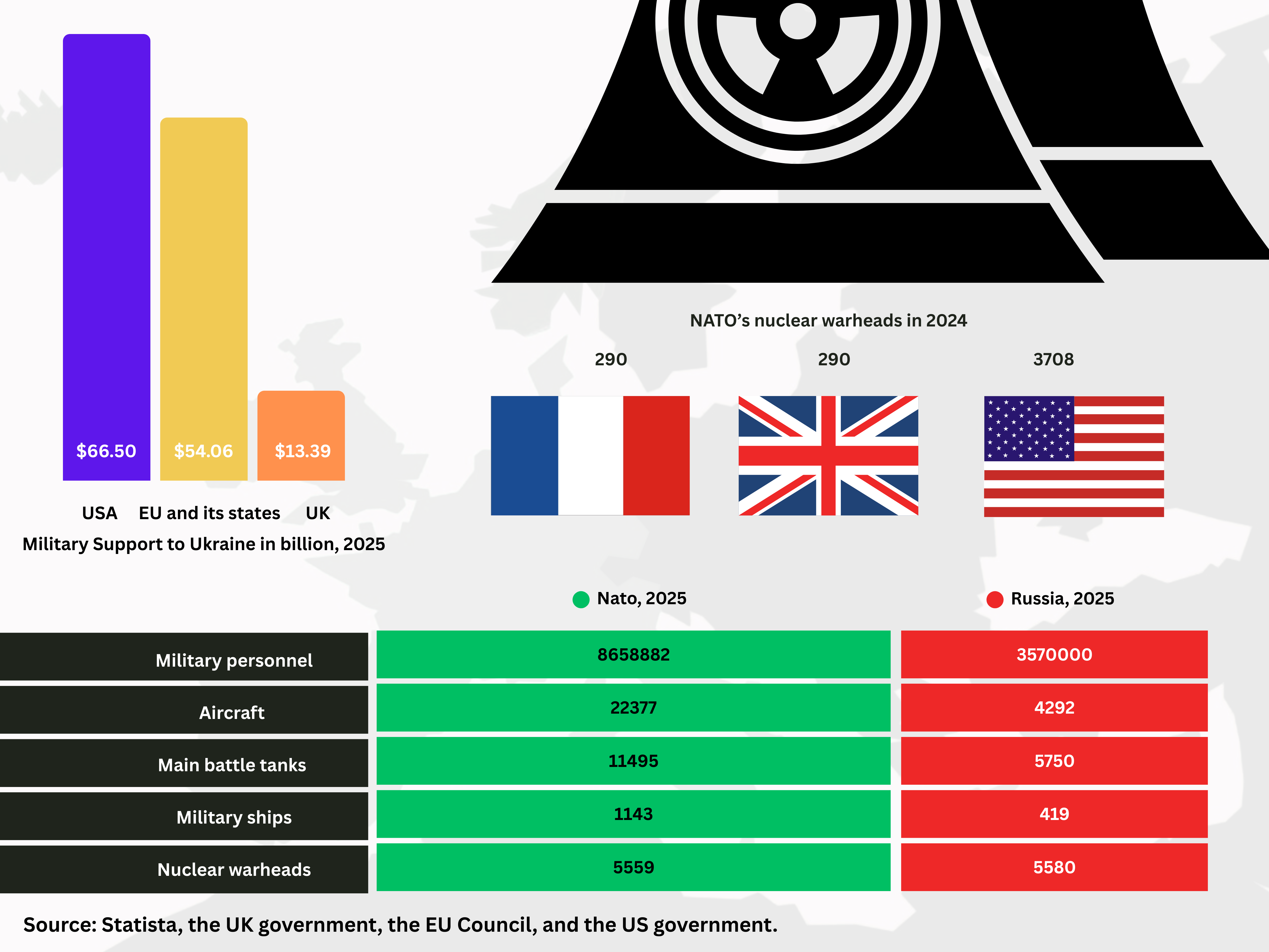 Military support from the US, EU states, and the UK to Ukraine since the beginning of the Russian invasion, alongside a comparison between NATO and Russian forces and nuclear warheads in 2025, including a comparison of nuclear warheads between France, the UK, and the US in 2024.