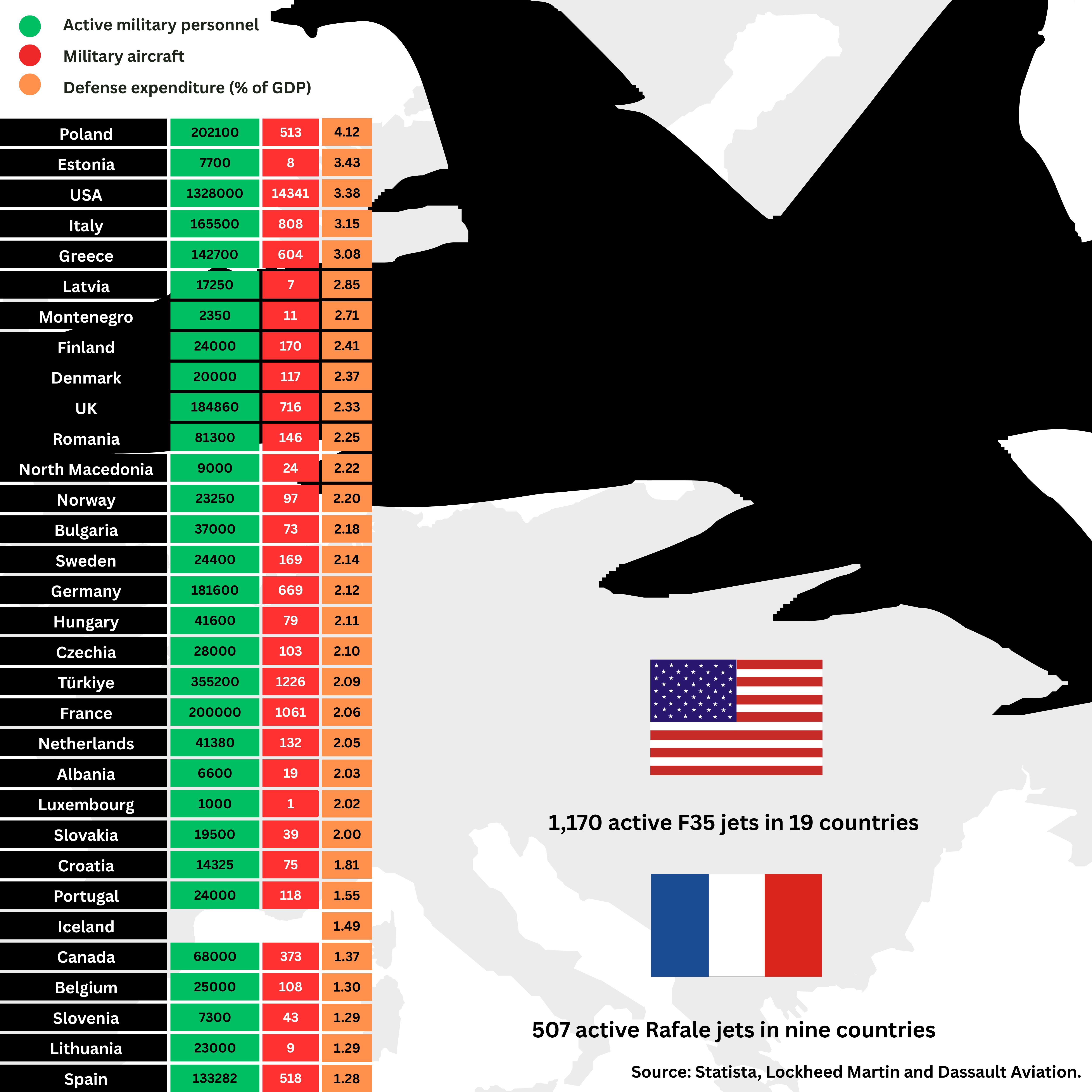 Comparison between NATO member states in terms of active military personnel, military aircraft, and defence expenditure, in addition to a comparison of the number and deployment of active F-35 and Rafale jets.